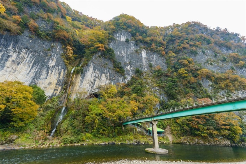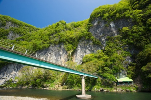 The Takahashi River carves a beautiful and dynamic gorge, forming the Atetsu Plateau, a karst landform. The towering cliffs of limestone, reaching a height of 240 meters, present a breathtaking view. In autumn, visitors can enjoy the beautiful contrast of the autumn leaves against the gray limestone.