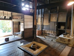 This establishment, operational for over 80 years, operates as a lumber store. It includes a dirt floor, an irori (traditional sunken hearth), a veranda, a well, a hallway, a sunken kotatsu table, ...
