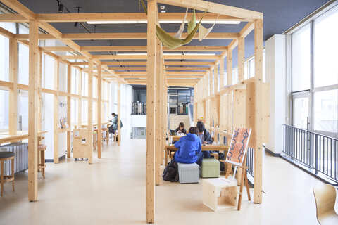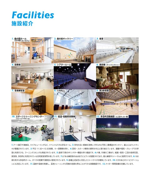 その他、カフェスペースを備えた学生ホールにあたる「森の間ホール」、円形二重構造のギャラリーである「森の岩ギャラリー」、各種体育館等様々な施設があります。