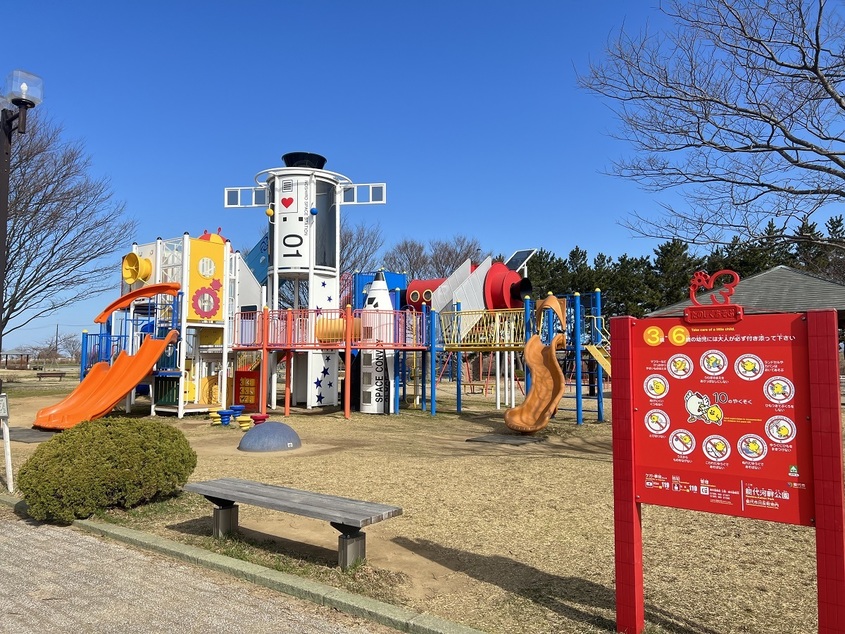 ロケットをモチーフにした大型複合遊具や砂場などがあり、子どもが元気に遊べます。