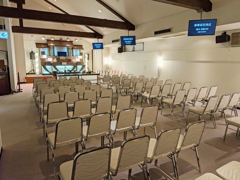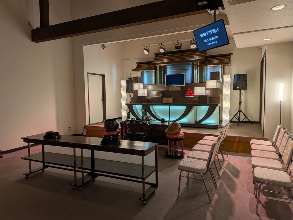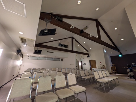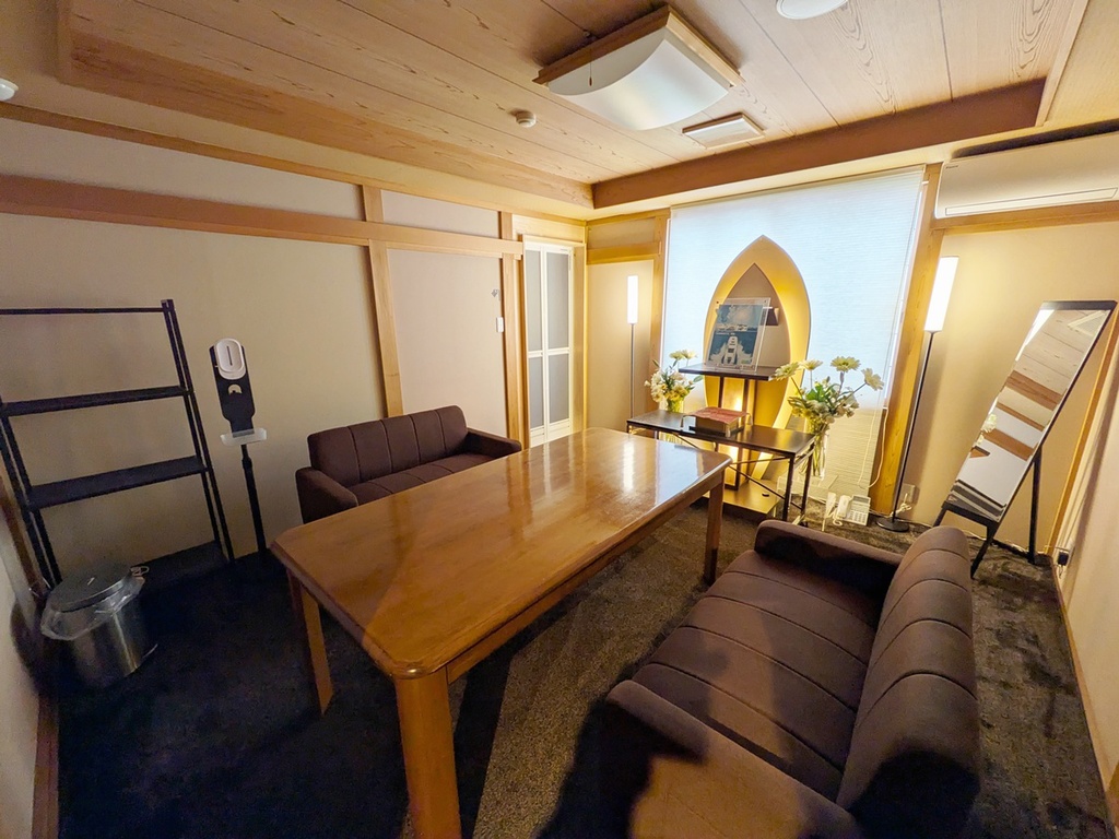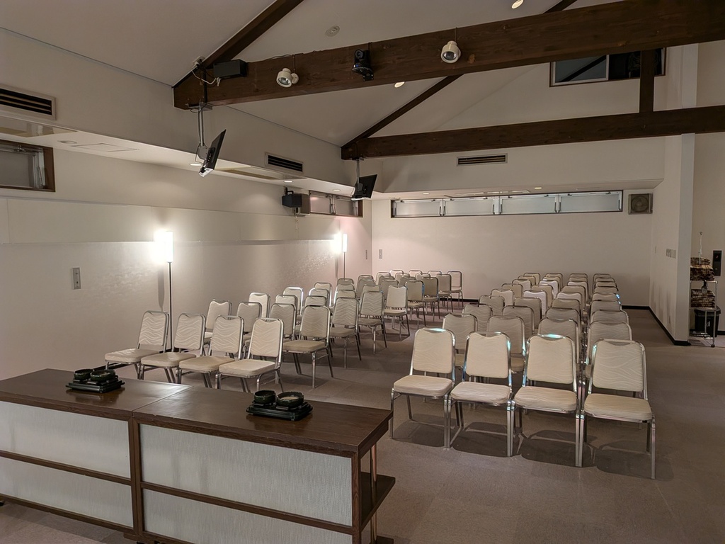 - 中規模の葬祭場です。1階には受付のほか、食事を提供するカフェや、宿泊可能な個室を1部屋備えています。2階が斎場となっています。葬祭場でありながら、全体的にカジュアルで落ち着いた雰囲気が特徴で、葬儀シーンはもちろん、装飾次第で多様なシチュエーションの撮影に対応可能です。また、併設する砂利の駐車場は約40m×20mと広大なスペースを有しており、セットの建て込みなどにもご活用いただける可能性があります。