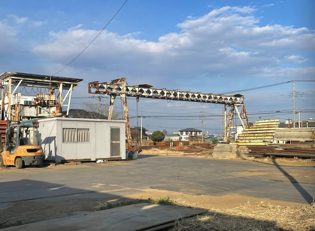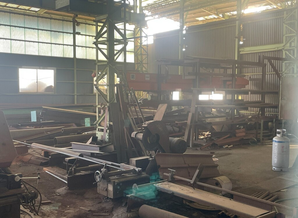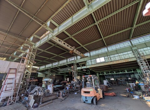 鉄骨むき出しの構造と広い作業空間が特徴で、昭和の雰囲気を色濃く残しています。鋼材や加工設備が並ぶ実稼働中の工場で、リアリティのある工場シーンの撮影に適しています。敷地内は大型車両侵入可能で、機材搬入にも対応出来ます。アーク溶接設備、フォークリフトを保有し、有資格者も在籍しているので簡易加工の相談も可能です。
