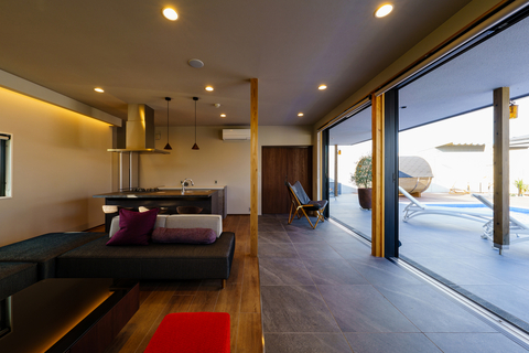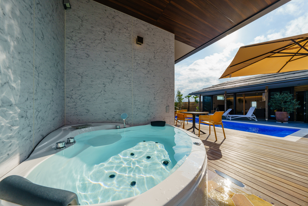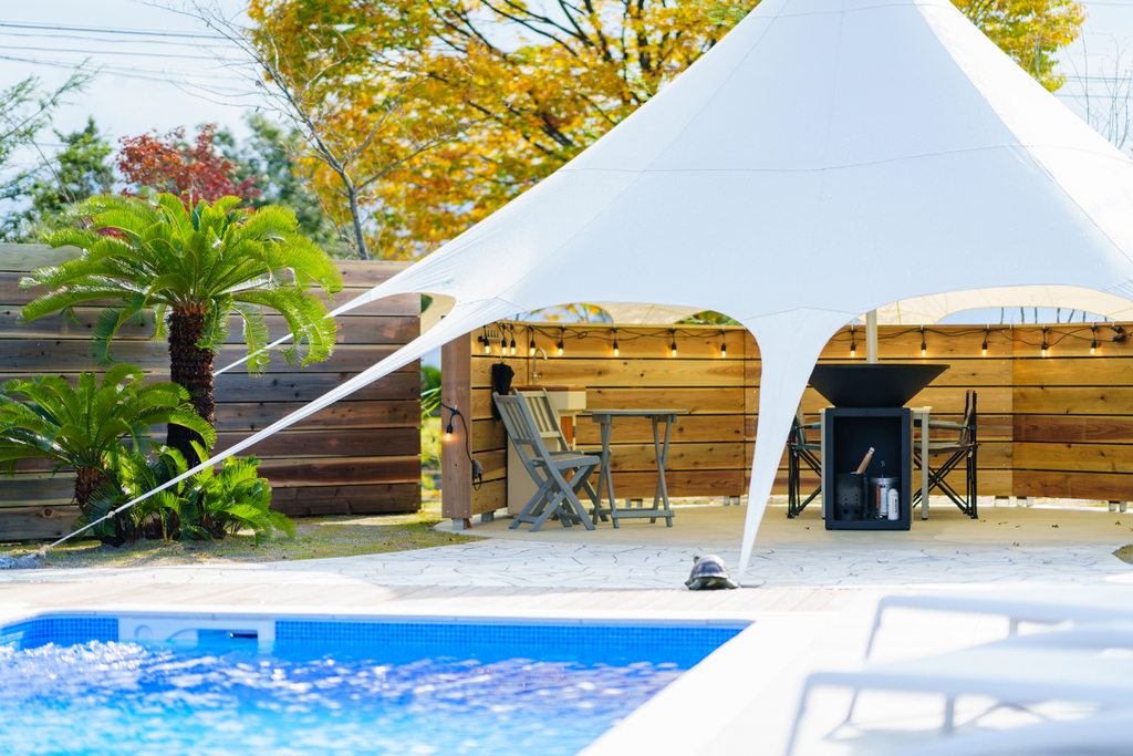 阿賀野市にあるプール、バレルサウナ付きのプライベートヴィラ。プールサイドにはカフェが併設されていますが、ご利用時はパーテーションで仕切るため、プライベートスペースとしてお使い頂けます。建物内にはキッチンあり。プールサイドにはBBQテントがあります。