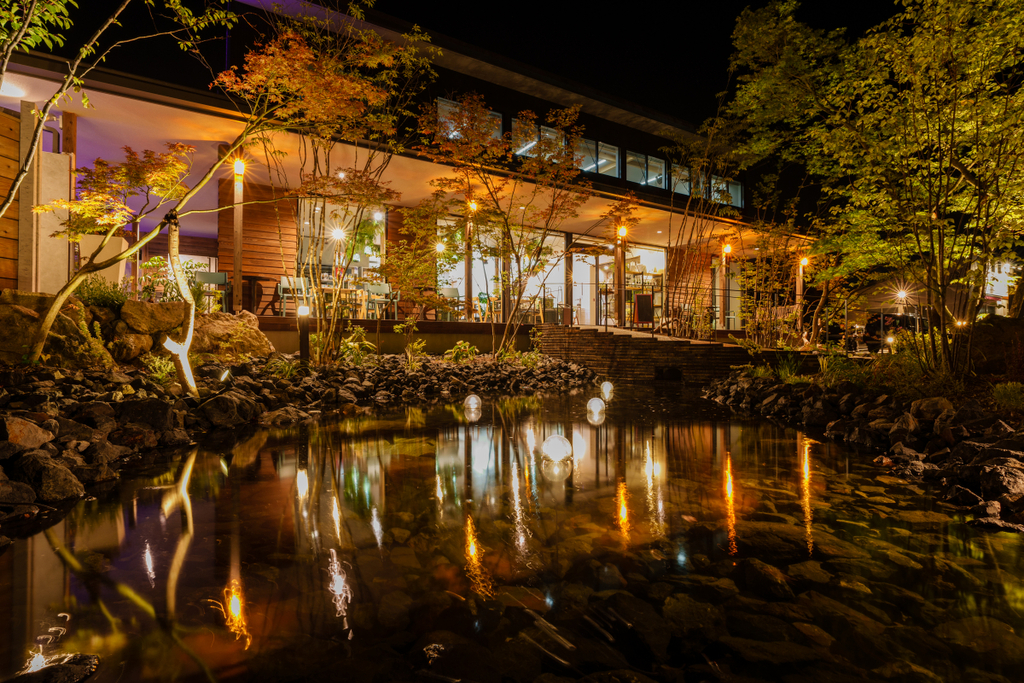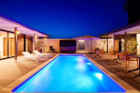 夜間はプールサイドだけでなく、庭全体もライティングされており、幻想的な空間が広がります。