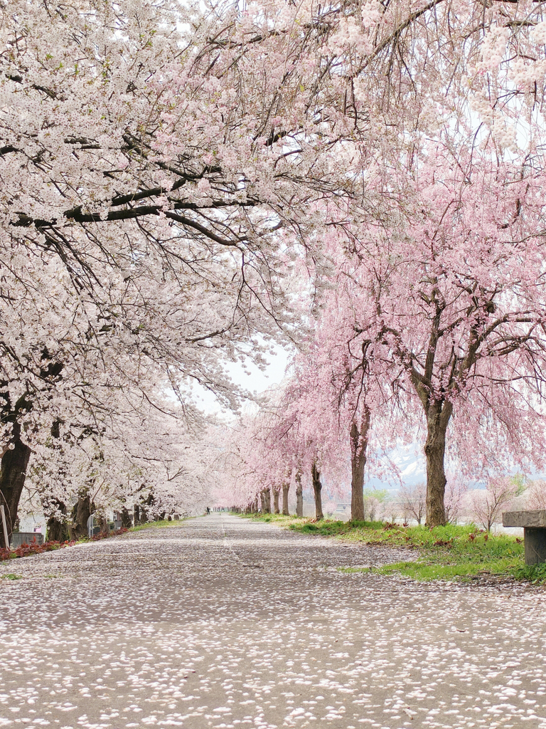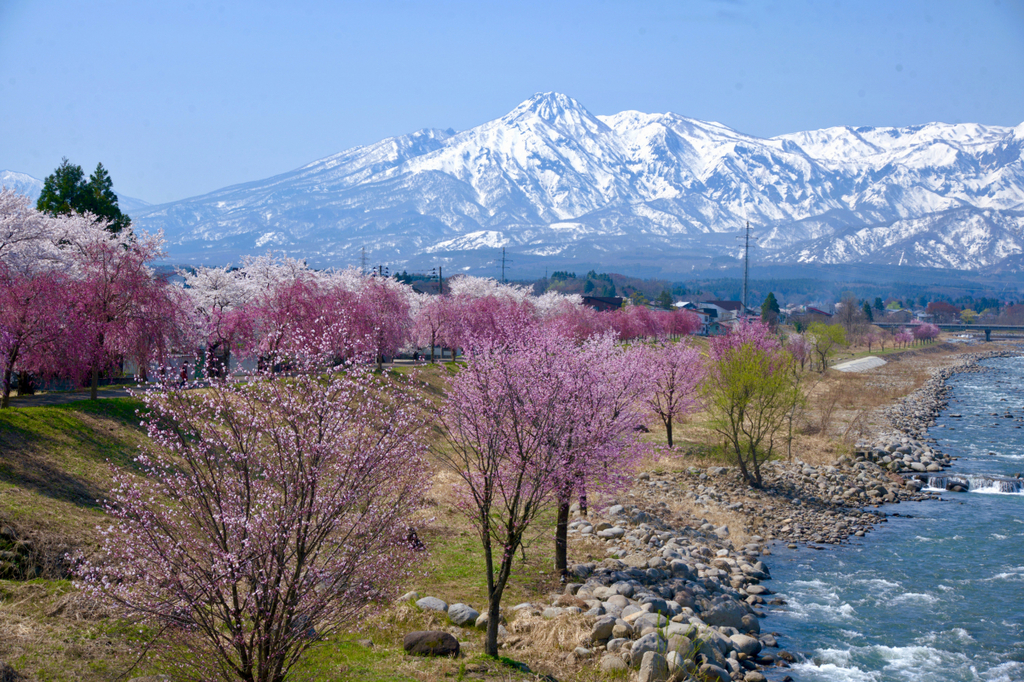 - 桜並木と冠雪の妙高山を一緒に眺めることができることができるスポットです。