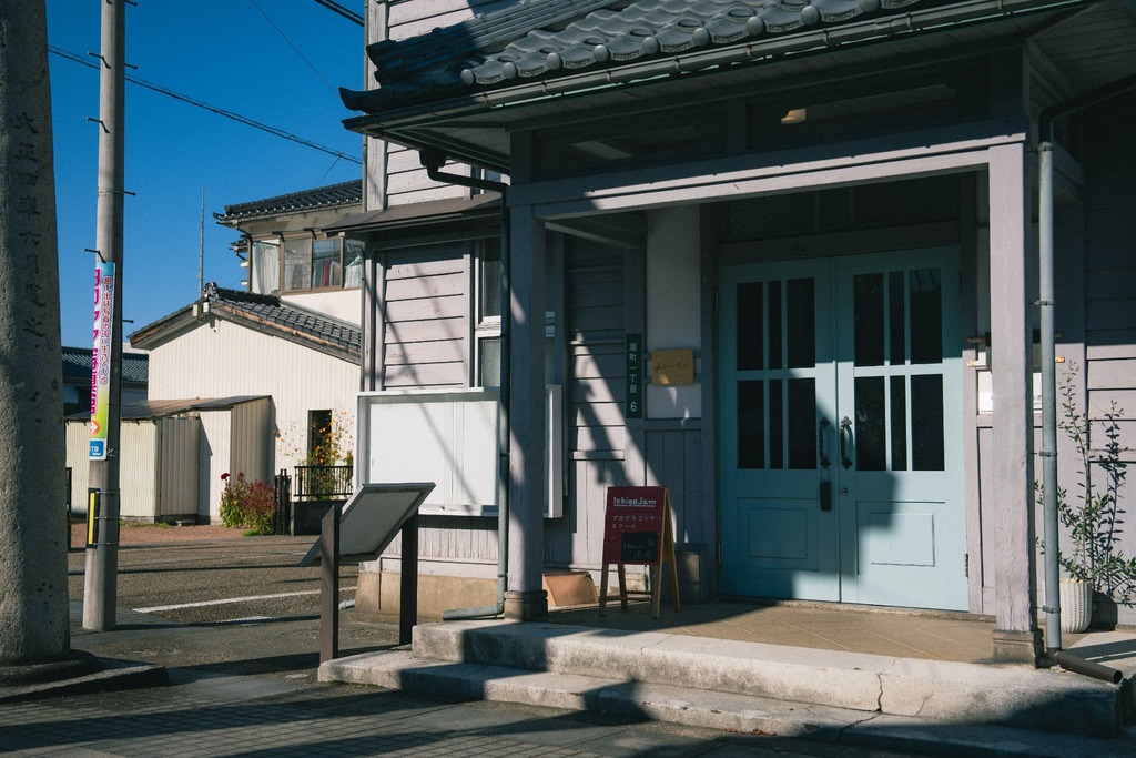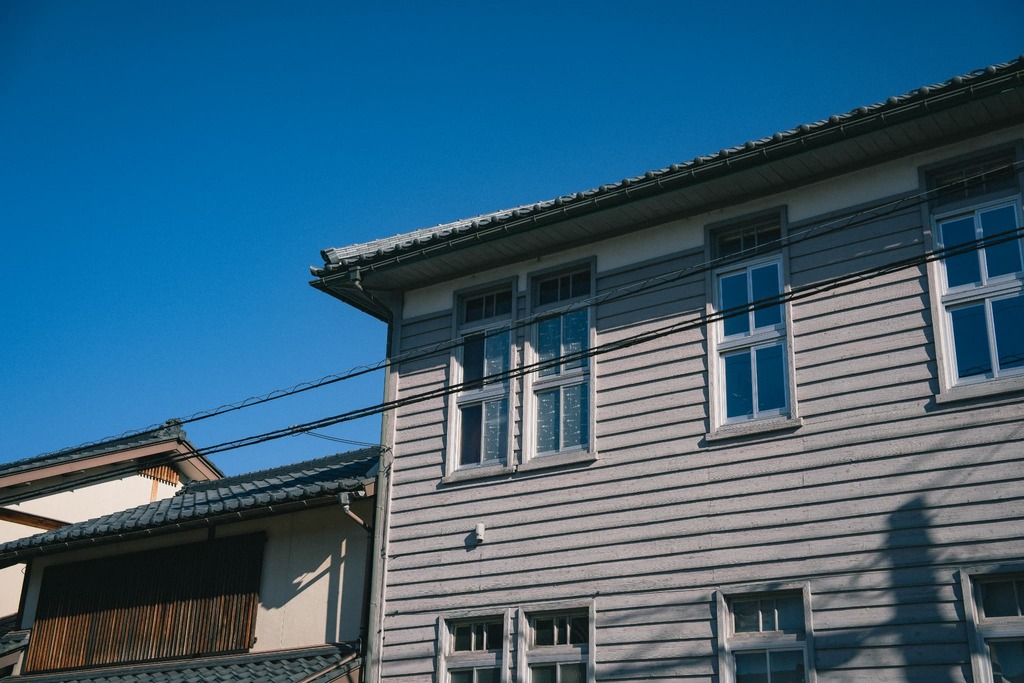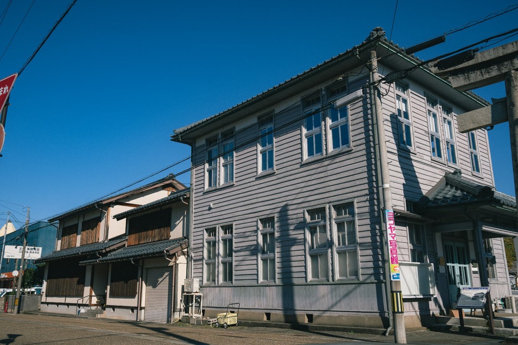 「旧鯖江地方織物検査所」は、昭和10年(1935年)に建設された木造2階建ての洋風建築で、かつて人絹織物の検査業務を担っていました。​外壁はドイツ下見板張りと南京下見板張りを組み合わせ、軒下には白漆喰の小壁が巡らされるなど、当時の建築様式を色濃く残しています。​鯖江が繊維産業で栄えた時代の象徴的な建物であり、現在は「Hana道場」として活用され、地域の歴史と未来をつなぐ場となっています。