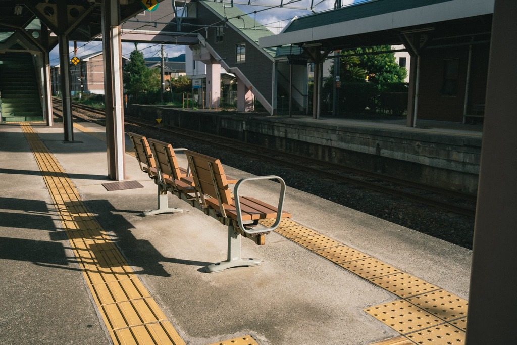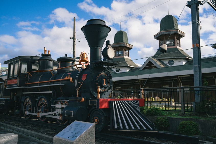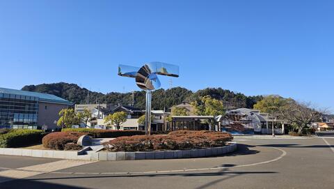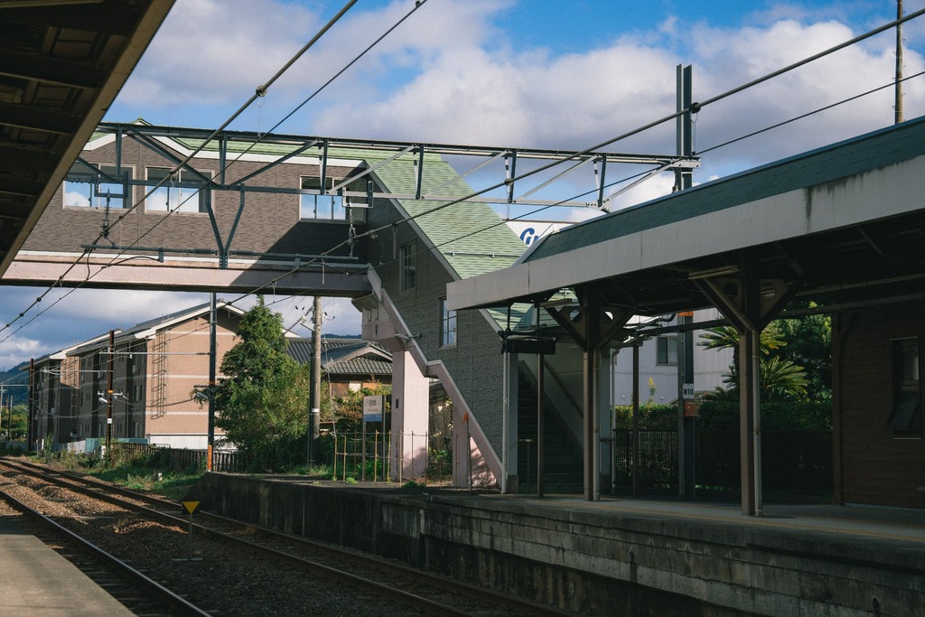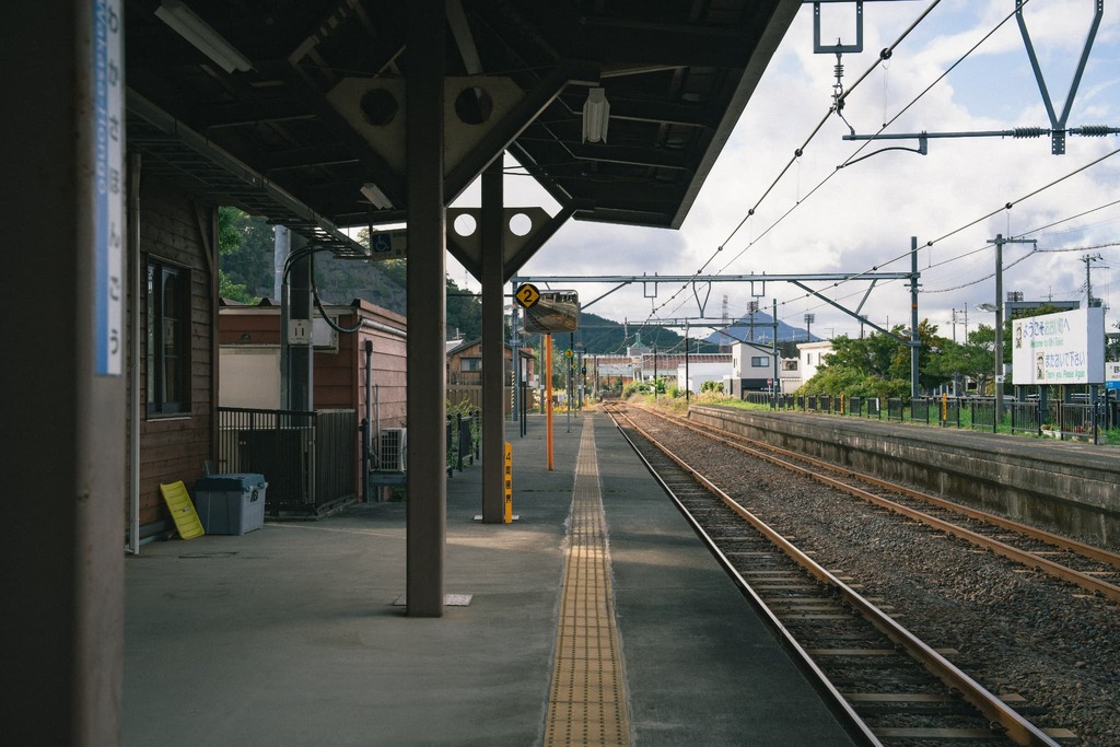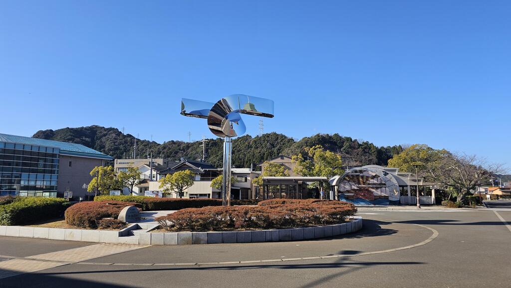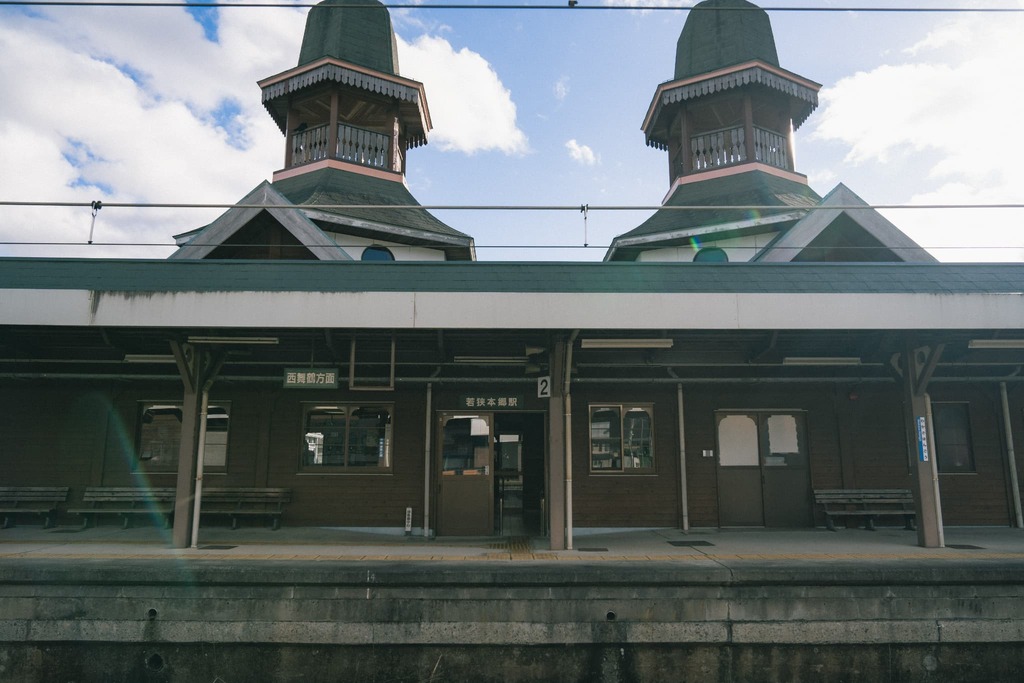 JR小浜線の駅。駅舎は、1990年(平成2年)に開催された国際花と緑の博覧会(花博)で展示されていた「風車の駅」を移築したもので、「風車会館」とも呼ばれている。また、国道27号に面した「情報交差点ぽーたる」には、花博で走行した「ドリーム・エキスプレス義経号」のレプリカが展示されている。