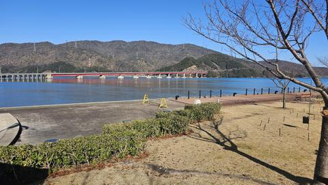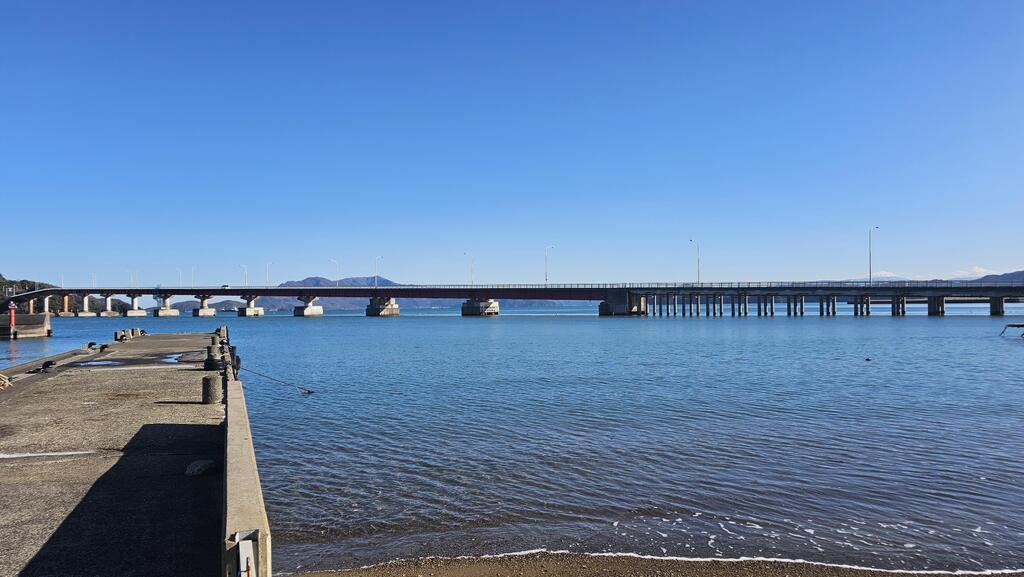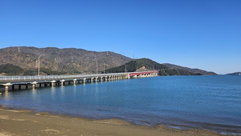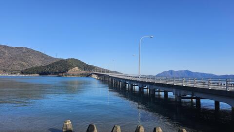 小浜湾南西部の青戸の入江から大島半島に渡る橋。青い海にかかる赤い橋が鮮やかです。