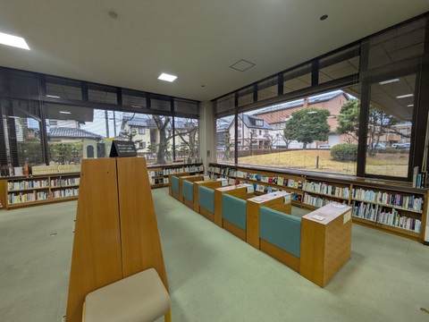 外壁が赤レンガ調のタイル張りで、1989年建設の図書館。