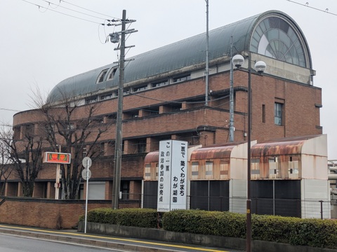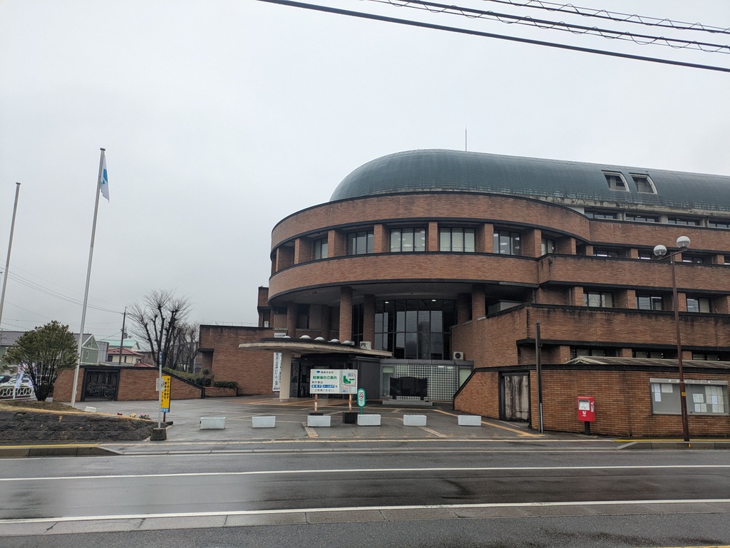 外壁が赤レンガ調のタイル張りで、1978年建設の行政庁舎。
