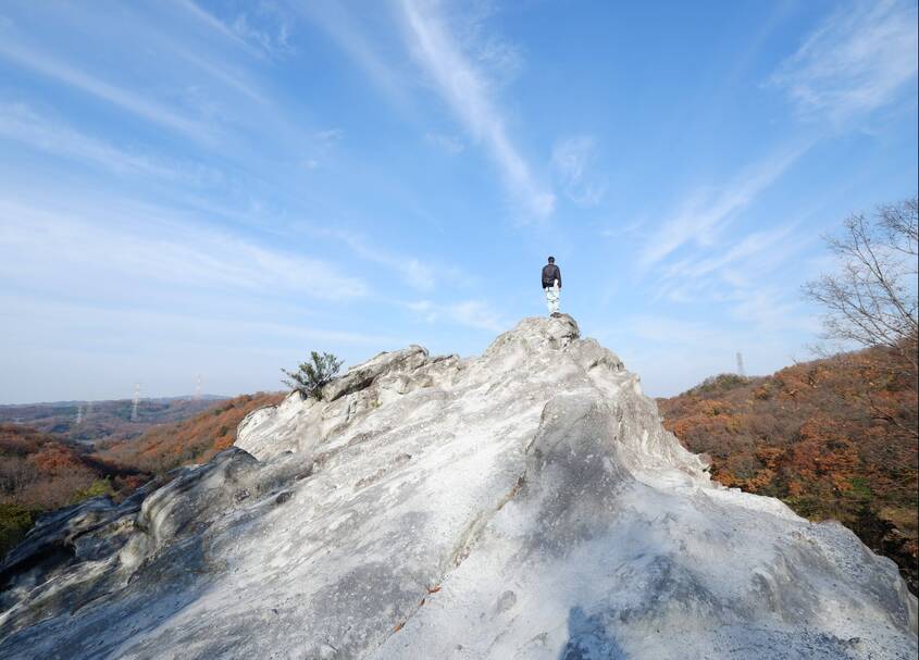 - 千数百万年前に二上山の火山活動によって火砕流や火山灰などが堆積し、その後の地殻変動によって隆起し、さらに、長い年月の間に侵食されて現在の姿になりました。古くは古墳の石棺材や寺院の基壇などの石材として利用されました。遠くから見ると鶴が屯(たむろ)しているような奇観のため、この名称で呼ばれるようになりました。