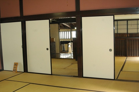 また、式台上部の水引き虹棟には若葉を施し、蟇股には雲と梅鉢の家紋彫刻している。玄関の間の南側にある十二畳の「座敷」には本床造り、違い棚には天袋、付書院には禅宗風の火燈窓(花頭窓)が残り、柱はぜいたくな数寄屋風の面皮柱を使い、その東隣りの四畳半の押入れを隔てる壁には下地窓(塗りさし窓)が設けられ、床柱を省略した数寄屋造りの面影を残している。