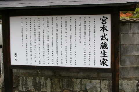 武蔵は天正12年誕生。父・祖父ともに十手術の達人という武術家に生まれ育ちました。建物は昭和に火災で焼失し、昭和17年に現在の瓦屋になりました。昭和34年には、宅跡が「岡山県史跡」に指定されました。