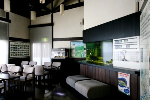 - 町木の赤松を使い、太い梁を生かした伝統工法によって建てられた建物は木の温もりを感じるくつろぎの空間となっています。外観は水楼をモチーフにした高さ16mの「水見やぐら」が目印。最上階からは360度広がる町の眺望が楽しめます。