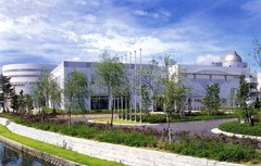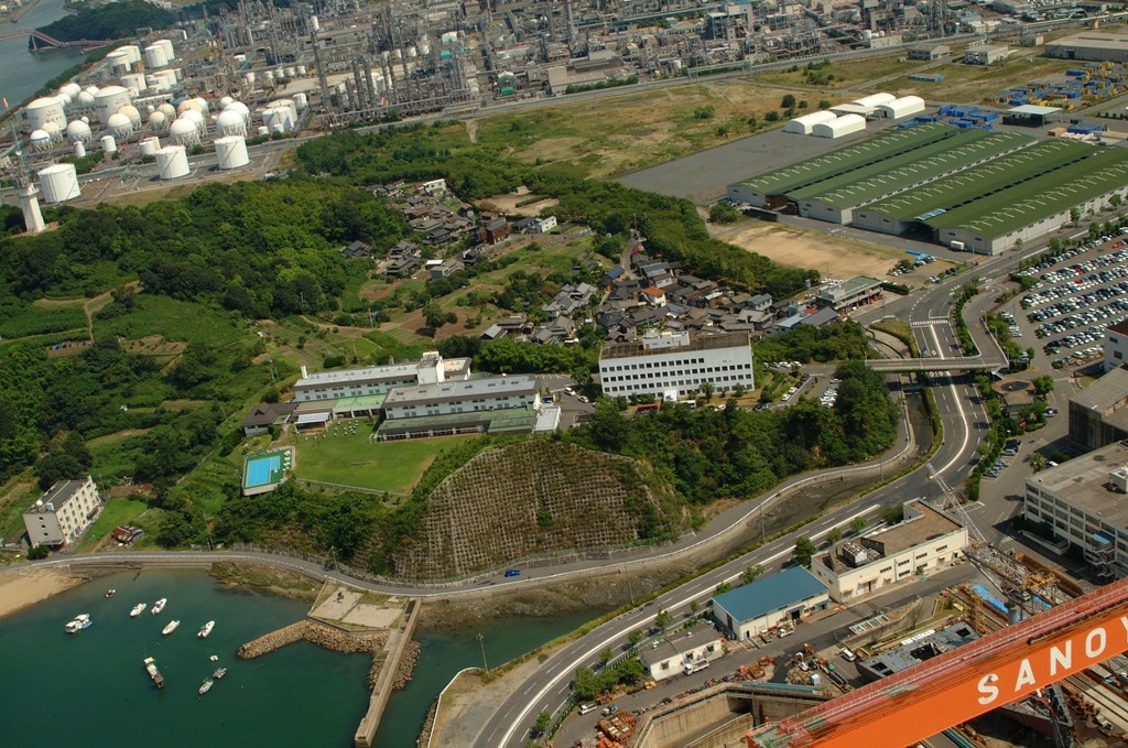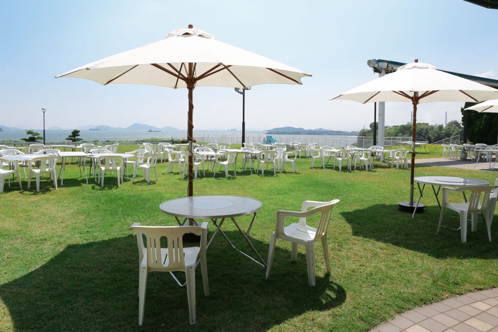 - 水島コンビナートの一角に有り、瀬戸内海水島灘を見下ろす、広い芝生庭園の向こう側には工業地帯が広がっています。