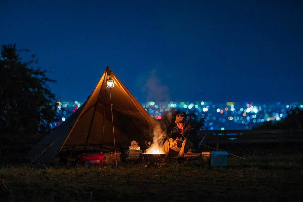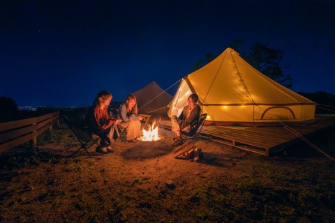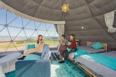 敷地内にはカフェ併設の本棟、グランピングテント、ドームテント、キャンプ用の区画サイトがあり、夜景を見ながら夕食のBBQが楽しめるような施設となっています。