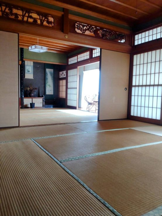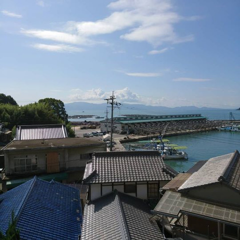 八畳二間の和室と、20メートルの廊下のある築50年の日本家屋。漁港から小さな路地を入り、坂の上の高台に建っています。2階からは眼下に漁港と牡蠣処理場の工場、小豆島や長島などの瀬戸内の島々も望むことができます。