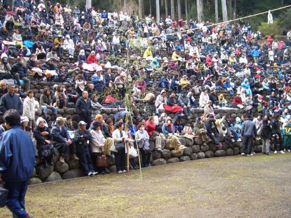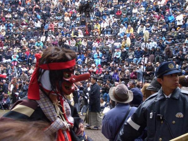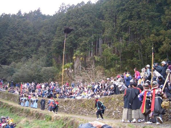 最大の見どころは、鳥毛と呼ばれる大きな棒を十数mの距離で火事装束の若者が投げ合う「鳥毛ひねり」。