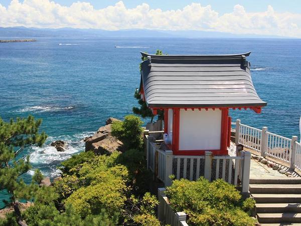龍頭岬と龍王岬の間に弓状に 広がる海岸で、白い砂浜と五色の石、松の緑に紺碧の海が箱庭のように調和する見事な景色。