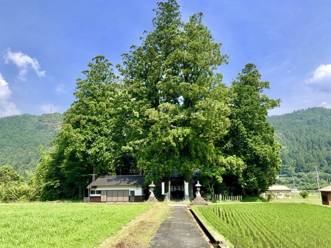 田んぼの中に、この場所だけ木で覆われているのが印象的な神社。