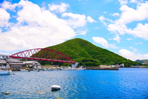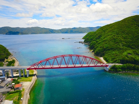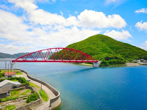 - 奥浦地区から戸岐方面に向かう途中にある赤が印象的なアーチ型の戸岐大橋。1979年(昭和54年)、戸岐湾を望む絶景の場所に架けられました。