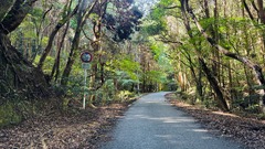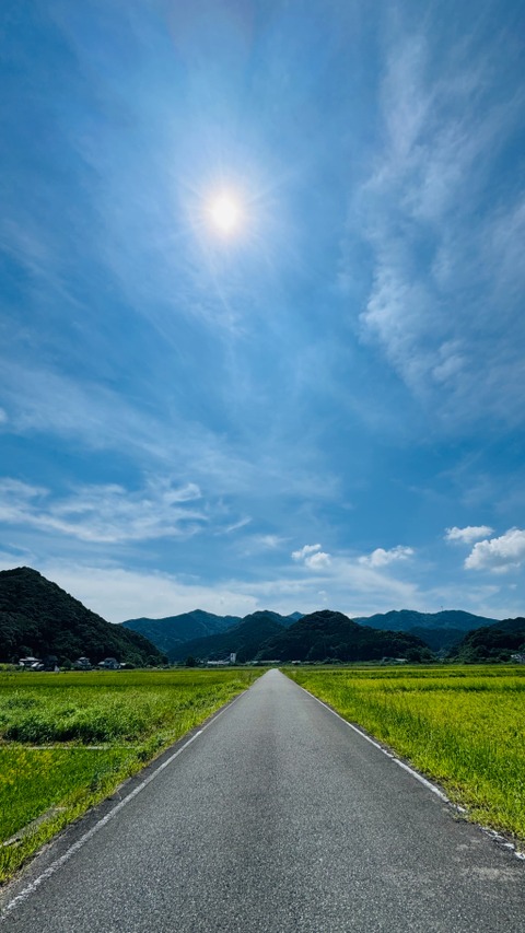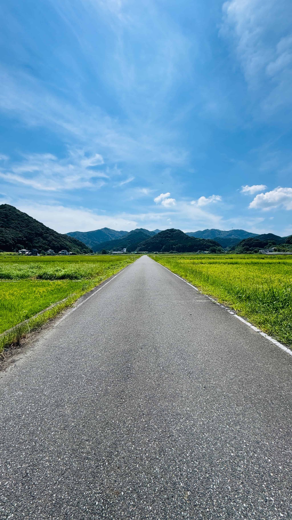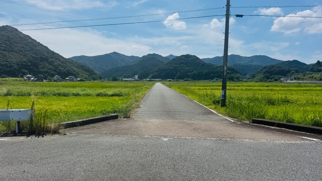 旧熊本県立天草高校天草西校の跡地の前に広がる農道。周りを山に囲まれ、高い建物もなく、のどかな田園風景が広がる