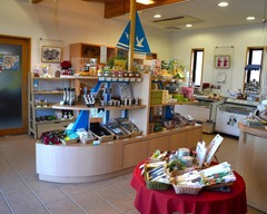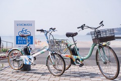 前島行きフェリー乗り場の目の前にある、土産品の販売やレンタサイクルの貸し出し、観光案内などを行っている施設。青空と海にマッチした恋ポストも設置されている。