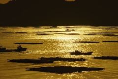 島と島の間の海面から昇る朝日は平安時代の歌人に詠まれた有名な美しい景色。現在も牡蠣筏が浮かぶ景色が手前にあり、その向こうの海面、島から昇る朝日が美しく、写真愛好者から人気。日中も青い空と牡蠣筏が浮...