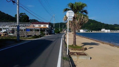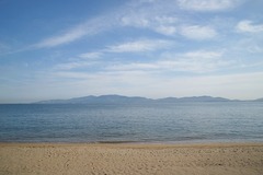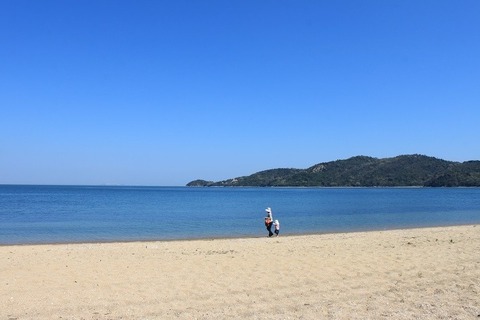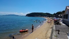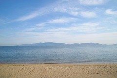 小豆島の島影を目前にする道路脇の長さ約400mの白砂のビーチ。 近年ショップができたことでSUPが盛ん。 カフェやグランピングの店舗もある。