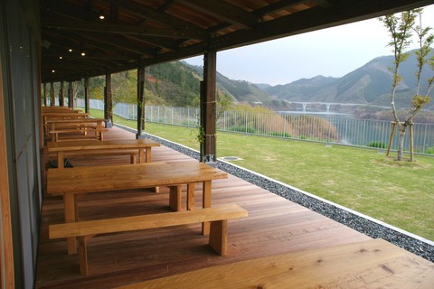 観光情報やカヌー体験の受付を行うビジターセンター。奥津湖が一望できるロケーションを楽しめます。湖畔に広がるフィールドはサイクリングや散策にぴったり。