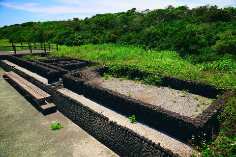 勘次ケ城跡は、富江町南部の低い溶岩台地上の海岸部に構築された砦状の遺構です。「山崎の石塁」ともよばれ、1970年に県の指定史跡になりました。 今から150年ほど前、大工の勘次が河童と築いた石の城という説...