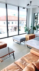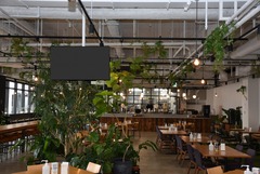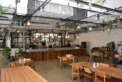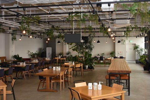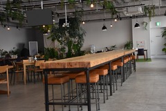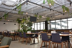 店内は緑に囲まれた開放的な雰囲気。岡山の街ナカでピクニック気分が楽しめるカフェテリア。カフェやレストラン、パーティーシーン、社員食堂や学食としても利用できます。