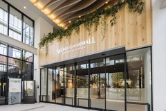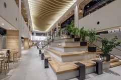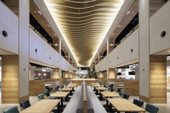 「杜の街グレース」内の商業・ヘルスケア施設棟。 1階は約2,800㎡の広々としたフードホールに、岡山・瀬戸内の食を楽しめる個性豊かな飲食店が軒を連ねます。 2階へとつながる吹き抜けの先には瀬戸内の波をデザイ...