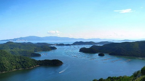 海と島々が眺められる絶景スポット。眼下には牡蠣イカダが浮かんでいる。
